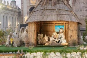 Vatican City, Italy – January 2, 2025: wood carved figures depicting the nativity scene outside St. Peter’s Basilica in St. Peter’s Square